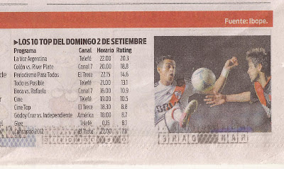 De lo que surge publicado por el Diario Popular, el pasado 2 de septiembre, La voz Argentina superó por menos de un punto a Colón (hasta entonces puntero) y River